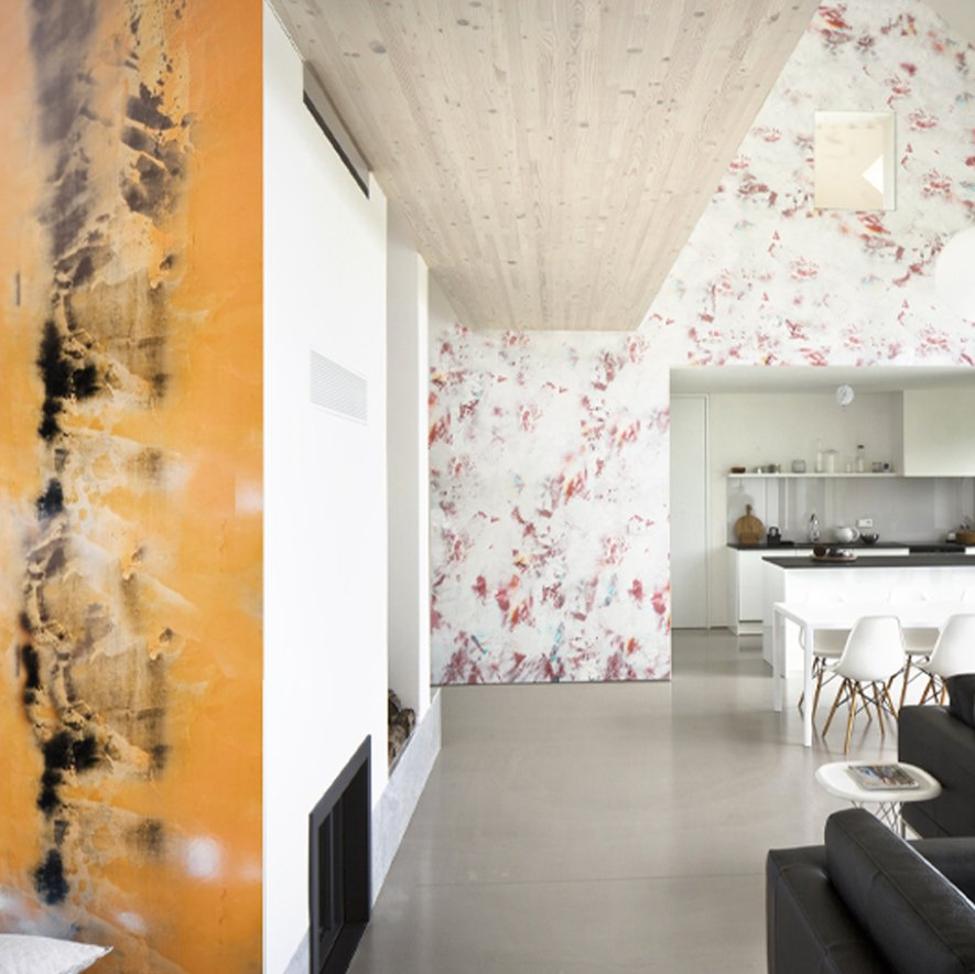 Revestimento de material à base de cal adequado para interiores e exteriores que reproduz o efeito do mármore do travertino ao riscado ao urbano ao natural ao estratificado aos veios típicos do mármore real.