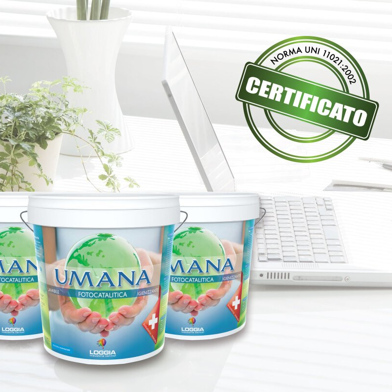 Umana es una nueva pintura arquitectónica blanca lavable, es el resultado de profundos estudios de los Laboratorios, que han creado una pintura de fácil aplicación y con propiedades descontaminantes gracias a un proceso fotocatalítico natural, desencadenado por la luz solar y una acción higienizante segura eficacia. Umana ha sido diseñado para hacer que las habitaciones sean más saludables al purificar el aire diariamente, mejorando así la calidad de vida.
